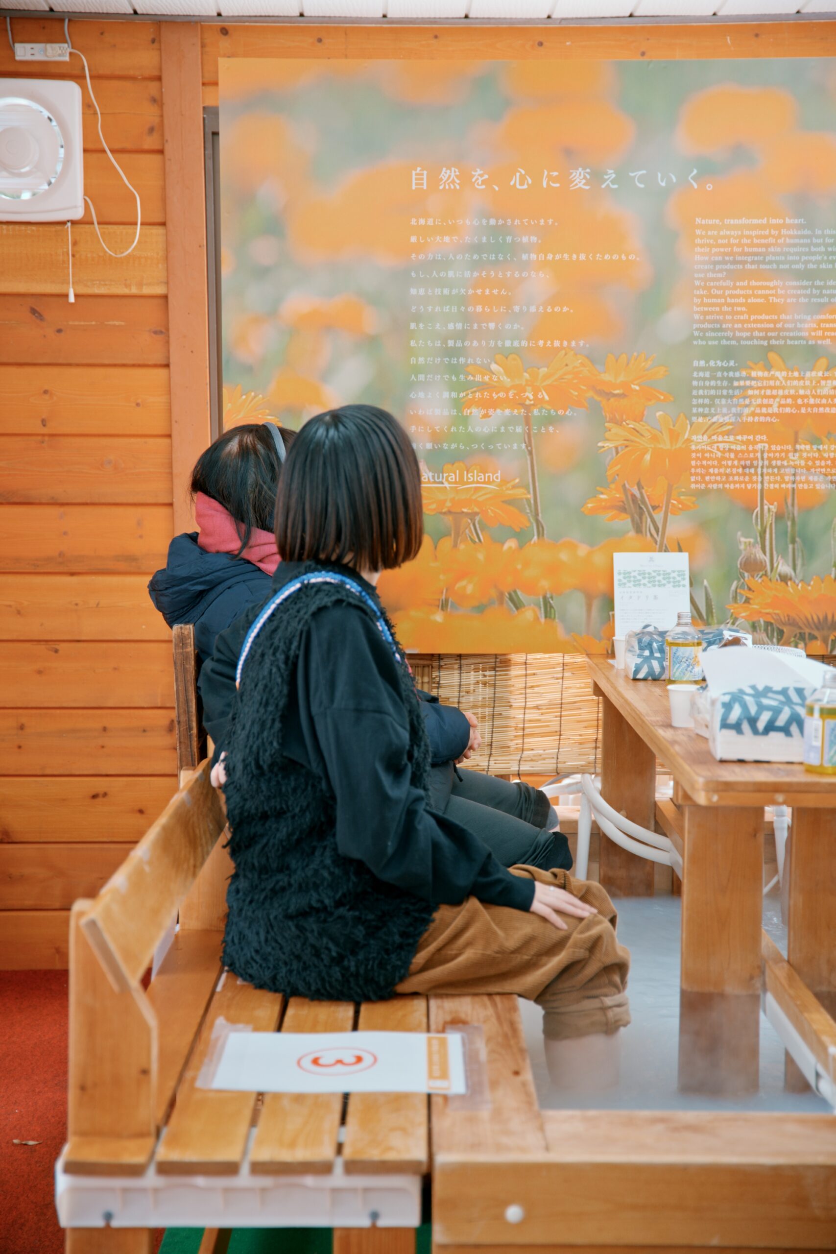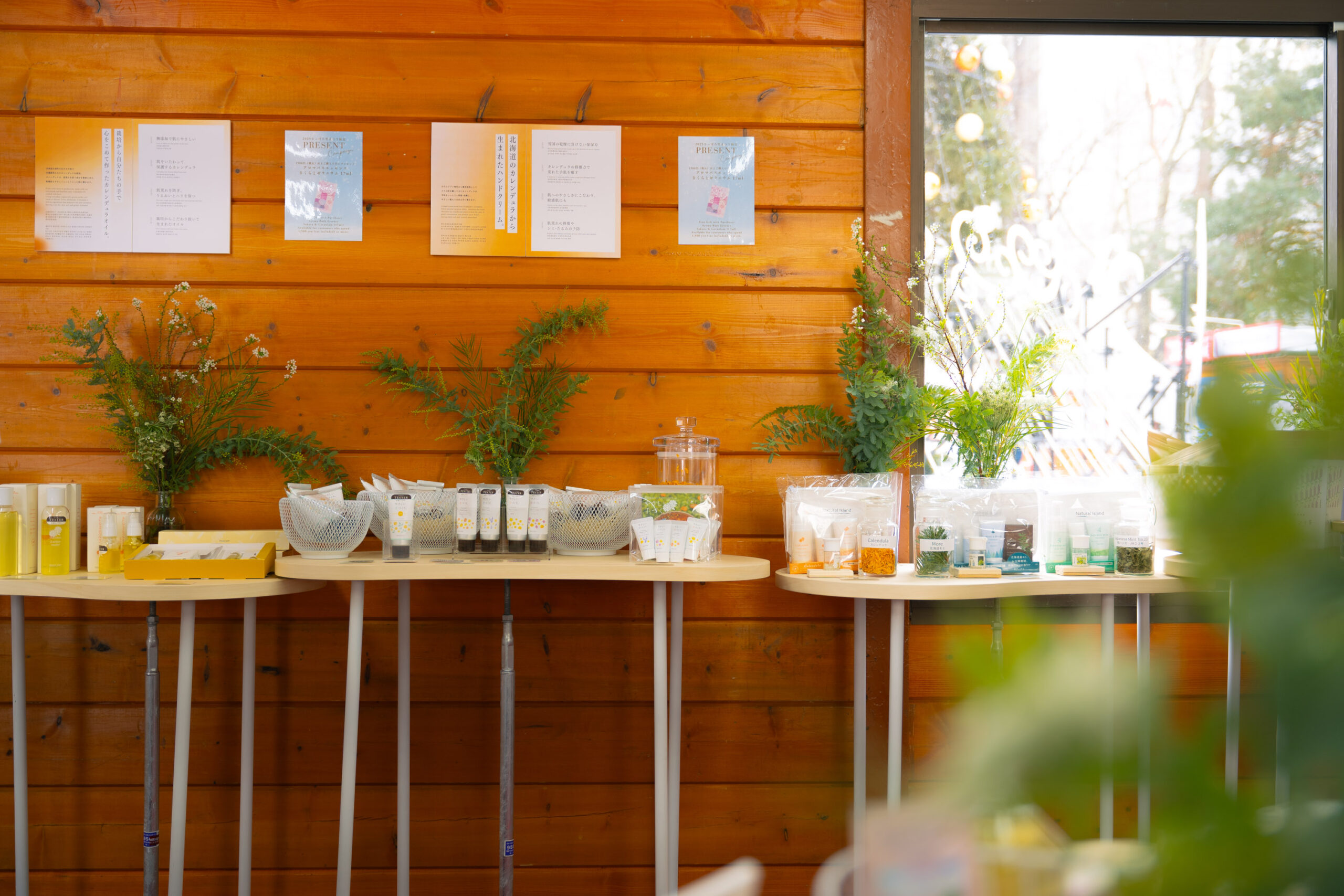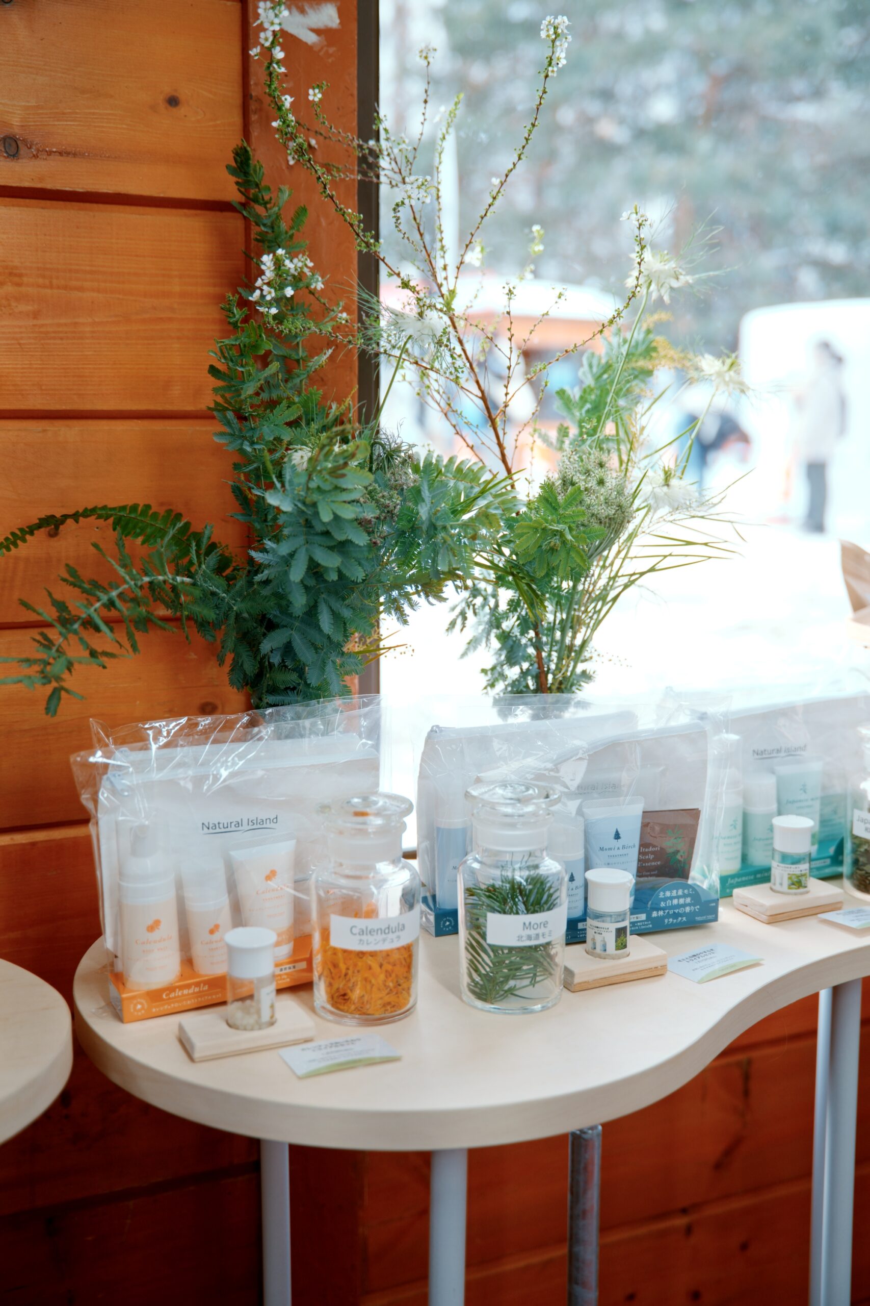 また、既存のブースフォーマットという制約の中で、どのように北海道の自然から生まれたスキンケアやバスアイテムの背景まで伝えられるかを重視。装花はJaz flower shop様に依頼し、世界観を空間全体で表現しました。