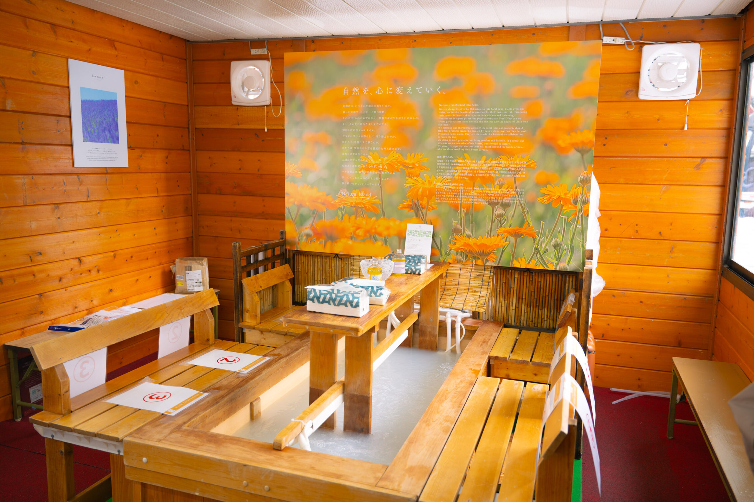 制作にあたっては、ブランドが長年大切にしてきた「カレンデュラ」のオレンジ色をキーカラーに設定。混雑する会場の中で視認性を確保しながら、植物由来のやさしさや誠実なものづくりの姿勢、足湯体験によるあたたかさを感じられるよう、メインビジュアルからPOPの細部に至るまで設計しています。
